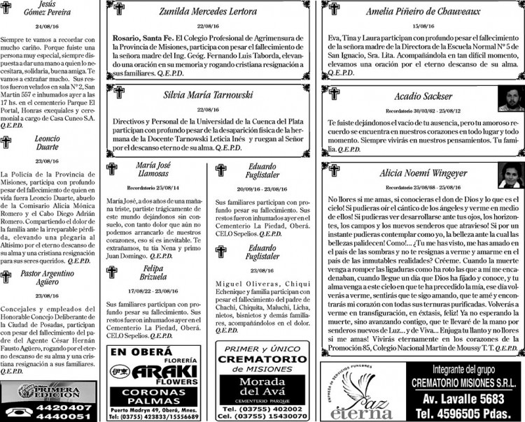 Fúnebres del jueves 25 de agosto de 2016