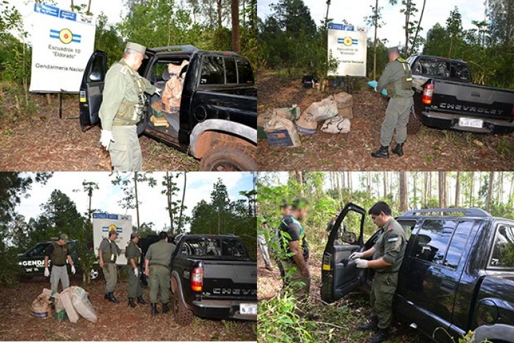 Gendarmería Nacional incautó 148,525 kilos de marihuana acondicionados en nueve bolsas de arpillera, que eran transportados en una camioneta, el viernes en un control de rutina en la ruta nacional 12.Los efectivos dependientes del Escuadrón 10 Eldorado de GN efectuaban un control público de prevención sobre citada arteria en la intersección con la ruta provincial N° 18 cuando observaron que el chofer de una camioneta Chevrolet S10, al advertir la presencia del personal de la Fuerza, efectuó una maniobra brusca, dirigiéndose hacia un camino secundario. Al advertir esto, los gendarmes iniciaron un rastrillaje en la zona y hallaron el rodado sin ocupantes oculto en una plantación de yerba.Ante testigos, se constató que en el asiento delantero del acompañante y en el asiento trasero había nueve bolsas de arpillera con 175 paquetes que contenían “cannabis sativa” (marihuana).  Interviene en la causa el Juzgado Federal de Eldorado, quien dispuso el secuestro de la droga y de elementos de interés para la causa.