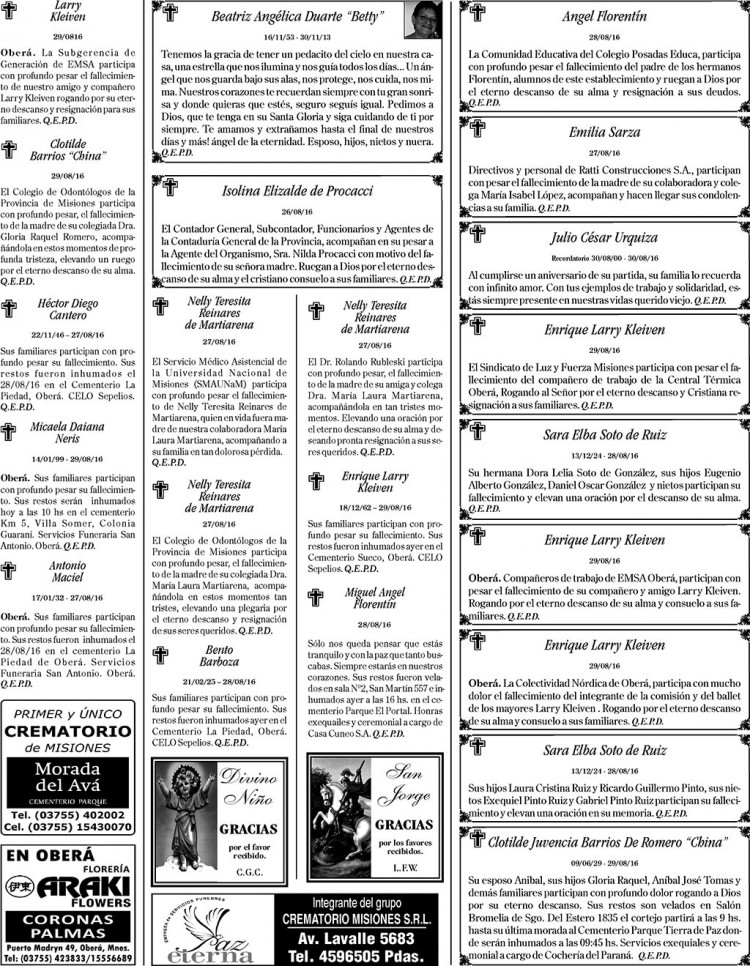 Fúnebres del martes 30 de agosto de 2016