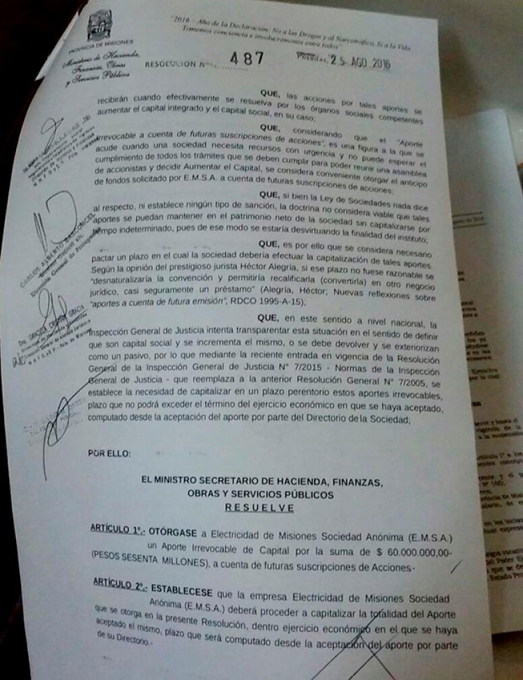 A pesar de todas las medidas que se tomaron en marzo, como la reducción de gastos, la supuesta transparencia y la auditoría, Emsa sigue siendo un agujero negro que se chupa la plata de los misioneros. En agosto, la empresa a través de su presidente Sergio “Piti” Ferreyra le pidió 60 millones de pesos a la Provincia, con el argumento de “dar continuidad a las inversiones que se realizan para la ampliación de la potencia de las estaciones transformadoras en distintos puntos de la provincia”.PRIMERA EDICIÓN accedió a una resolución del Gobierno provincial, con la firma de algunos funcionarios de segunda línea, aunque todavía no tiene la firma del gobernador Hugo Passalacqua, donde se autoriza el desembolso de la suma solicitada.Si el monto todavía no fue girado a la empresa, el trámite está en camino y podría efectuarse en los próximos días. La resolución tiene fecha 25 de agosto y el pedido de Emsa se realizó, a través de un acta del Directorio, el pasado 8 de agosto.Lo cierto es que Emsa no informa a donde se va el dinero que recibe y lo preocupante sería que se destine a sueldos y otros gastos corrientes. Las inversiones grandes, en los últimos años, se realizaron con fondos provenientes de la Nación.No es la primera vez que la Provincia gira abultadas sumas de dinero a Emsa. Esta mala costumbre empezó con el exgobernador Maurice Closs, quien enviaba más de 20 millones de pesos todos los meses.Este año, el presupuesto provincial que dejó Closs antes de abandonar el Gobierno, establece más de 200 millones de envíos de la Provincia para la deficitaria empresa estatal. Estos 60 millones serían parte de ese dinero presupuestado para el transcurso del año. En total, en los ocho primeros meses ya se habría otorgado cerca de 150 millones, según información extraoficial a la que accedió este diario. Antes, al parecer, hubo otros dos envíos de 60 y 40 millones respectivamente.El argumento que utiliza el Gobierno, desde la época de Closs, es el mismo: se otorga el dinero como “aporte irrevocable de capital” a cuenta de futuras suscripciones de acciones.Lo insólito es que la empresa no tiene dinero ni siquiera para el combustible de sus camionetas.Si esta situación no se revierte en los próximos meses o años, la empresa seguirá comiéndose el dinero de los misioneros todos los meses. Ni la auditoría ni el incremento de hasta 400% en la tarifa de luz que pagan los misioneros parece detener esta sangría de recursos.Sin luz y sin gasoilUn claro ejemplo de la situación catastrófica en que se encuentra la empresa se pudo apreciar el pasado domingo, en el informe que publicó PRIMERA EDICIÓN y donde daba cuenta que en el Distrito de Emsa de Andresito no tienen combustible para las camionetas y por eso no reparan los cortes de luz. Los responsables pidieron “fiado” en todos los lugares posibles, como siguen sin recursos, ya no tienen donde acudir.La misma situación se registra en San Pedro. Este martes, un empresario de la zona se comunicó con PRIMERA EDICIÓN para contar que estaban sin luz desde el día sábado.El socio de una papelera llegó el lunes de Buenos Aires, para revisar el funcionamiento del aserradero que poseen en Pozo Azul y explicó que “no tenemos luz desde el sábado. Le preguntamos a los responsables y nos respondieron que las camionetas no tienen combustible por eso no pueden hacer la reparación de la fase caída”.Ricardo de la Serna agregó que “esto no es nuevo, hace muchos años venimos padeciendo esta situación por falta de inversión. Se caen postes cada vez que llueve, corta la luz por semanas y ahora el colmo. No tienen combustible para la camioneta y por eso no reparan la luz”.