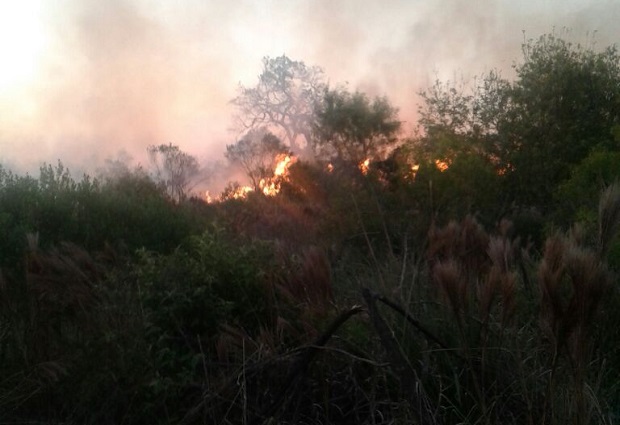 Un incendio forestal de grandes proporciones se desató este miércoles por la tarde en la zona del puente San Juan, en la reserva natural nacional Campo San Juan, y se extendieron rápidamente hacia las zonas cercanas, al punto de que un par de horas después ya era visible desde el peaje de Santa Ana sobre la ruta 12 y amenazaba incluso otras instalaciones linderas con la arteria nacional.A pesar del intenso trabajo de los bomberos de San Ignacio y de Corpus que participan en la extinción, la columna de fuego continúa avivándose producto del intenso viento en la zona y se requirió la presencia de más dotaciones toda vez que ahora podría expandirse hacia zonas pobladas de Santa Ana.