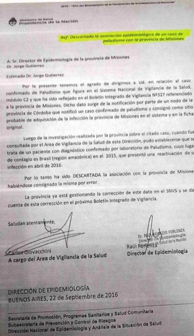 Autoridades nacionales de la Dirección de Epidemiología del Ministerio de Salud de la Nación han informado que se  "descarta la asociación de un caso de paludismo con la provincia de Misiones".La nota fue enviada ayer a la Dirección de Epidemiologia de Misiones. Fuente: salud.misiones.gov.ar