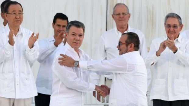 El presidente Juan Manuel Santos y el jefe máximo de la guerrilla Fuerzas Armadas Revolucionarias de Colombia (Farc), Rodrigo Londoño (Timochenko), firmaron este lunes por la tarde en la caribeña Cartagena un histórico acuerdo de paz para acabar con <a href="http://www.primeraedicion.com.ar/nota/230530/farc-52-anos-de-conflicto-armado-que-marcaron-a-colombia.html">52 </a><a href="http://www.primeraedicion.com.ar/nota/230530/farc-52-anos-de-conflicto-armado-que-marcaron-a-colombia.html">años de confrontación armada</a>.En una ceremonia solemne, frente a 15 jefes de estado y otros 2.500 invitados, el mandatario colombiano y el líder rebelde rubricaron con un "balígrafo" (una bala reconvertida en bolígrafo) el pacto de paz, que para entrar en vigor deberá ser ratificado por los colombianos en las urnas el próximo domingo.Entre la audiencia en la explanada frente al Palacio de Convenciones, teñida absolutamente de blanco, había unas 250 víctimas que escucharán a continuación a Santos y Londoño, enemigos por décadas, que lograron lo que parecía imposible.Se trata de un gran paso hacia el final del conflicto armado en Colombia, en el que también actuaron otras guerrillas, paramilitares y agentes del Estado, que dejó ocho millones de víctimas, entre ellas 260.000 muertos, 45.000 desaparecidos y 6,9 millones de desplazados.La ciudad amurallada, resplandeciente bajo un sol inclemente, se vistió de gala para la ocasión, adornada con palomas de la paz con una cinta amarilla, azul y roja, colores de la bandera colombiana.Entre los dignatarios asistentes están el cubano Raúl Castro, anfitrión de las conversaciones auspiciadas también por Noruega, Venezuela y Chile; <a href="http://www.primeraedicion.com.ar/nota/230527/macri-viaja-a-colombia-para-asistir-a-la-firma-del-historico-acuerdo.html">el presidente argentino Mauricio Macri</a>; el jefe de la diplomacia estadounidense, John Kerry; el secretario general de la ONU, Ban Ki-moon; el rey emérito de España, Juan Carlos, y numerosos representantes de organismos internacionales.Todos los invitados recibieron como obsequio una réplica del balígrafo usado para rubricar el acuerdo.Fuente: Noticias Argentinas
