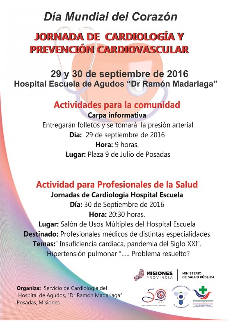 El Responsable de Cardiología del Hospital Escuela Dr. Ariel Szyszco informó que ubicarán una carpa informativa destinada a la comunidad. En la misma se controlará la presión arterial, al tiempo que se distribuirá folletería sobre arritmia e hipertensión arterial.Además recordó que el 30 de septiembre de 2016 realizarán la Jornada de Cardiología del Hospital Escuela, a partir de las 20:30 horas, en el Salón de Usos Múltiples de dicho Centro Asistencial. La actividad es totalmente gratuita.Se tratarán temas actuales de importancia para la actividad asistencial diaria destinados a profesionales médicos de distintas especialidades: ” Insuficiencia cardíaca, pandemia del Siglo XXI”. “Hipertensión pulmonar “….. Problema resuelto?Día Mundial del CorazónLa enfermedad cardiovascular es la epidemia del siglo XXI, para el año 2020 se espera que siete de cada diez muertes se deban a enfermedades no transmisibles, que de ellas la cardiopatía coronaria sea la causa principal y que los accidentes vasculares cerebrales ocupen el cuarto lugar, es por ello que el planeamiento y desarrollo de proyectos destinados a su prevención constituyan una herramienta fundamental.La Federación Mundial del Corazón con el apoyo de la OMS y la UNESCO ha designado el día 29 de septiembre del 2000 como el primer Día mundial del corazón. Esto obedece, a una estrategia para poder tener la oportunidad de dar a conocer masivamente las enfermedades cardiovasculares, su prevención, control y tratamiento.Organiza: Servicio de Cardiología del Hospital de Agudos, “Dr Ramón Madariaga” Posadas, Misiones. Con el apoyo y colaboración del Ministerio de Salud Pública de Misiones