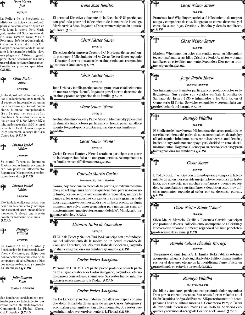 Fúnebres del jueves 29 de septiembre de 2016