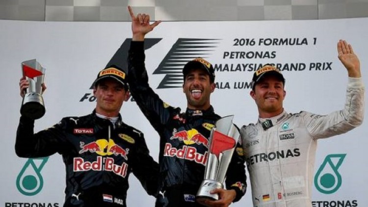 El británico Lewis Hamilton no vivió su mejor día. Obligado a abandonar por la rotura del motor de su Mercedes cuando lideraba el Gran Premio de Malasia, vio con decepción cómo Daniel Ricciardo ofrecía una segunda victoria a Red Bull esta temporada, mientras Rosberg era tercero.Ricciardo conquistó la 16ª de las 21 carreras que componen el Mundial, por delante de su compañero, el holandés Max Verstappen y del reforzado líder del Mundial, Nico Rosberg.Este último, que sufrió una sanción de 10 segundos por un roce con el finlandés Kimi Raikkonen, dio un golpe a la clasificación del Mundial aprovechando el abandono de Hamilton en la vuelta 41.Rosberg cuenta ahora con 23 puntos de ventaja (por los 8 que contaba al inicio del Gran Premio) sobre Hamilton, cuando restan cinco carreras por disputarse (125 puntos en juego).Ricciardo, que luchó hasta el final por evitar ser superado por Verstappen (19 años desde el viernes), firmó la cuarta victoria de su carrera, la primera esta temporada.En medio de un calor húmedo, la carrera vivió un espectacular inicio, con el incidente entre los alemanes Sebastian Vettel y Rosberg en la primera curva.El piloto de Ferrari, ganador en Sepang en 2015, se vio obligado a abandonar por daños en su suspensión, mientras que Rosberg fue relegado al puesto 17º.En una conversación de radio de Verstappen, se pudo escuchar al joven piloto calificando a Vettel de "idiota" y "loco".Fuente: Noticias Argentinas