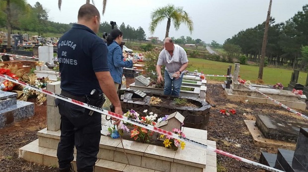 Un ritual que para la Iglesia tiene todas las características de ser de índole satánico conmocionó este domingo a los vecinos de Capioví, quienes despertaron con la horrenda novedad. Es que autoridades del cementerio local dieron cuenta a las autoridades policiales que en una tumba hallaron un animal porcino decapitado y con un cuchillo atravesado, una bolsa negra con dos pollos muertos -uno negro y otro colorado- como así también escrituras en varios papeles con nombres y apellidos de personas y botellas con bebidas alcohólicas, entre otros elementos. Personal policial convocó al párroco local, el padre Carlos Chatelain, quien realizó una bendición de la tumba. En diálogo con PRIMERA EDICIÓN, el sacerdote explicó que “es la primera vez que ocurre algo de esta naturaleza, es un hecho aislado. Retiramos las cosas que dejaron, las lavamos con agua bendita e hicimos una bendición a la tumba. Esto es más que nada una falta de respeto a los familiares de la persona que fue sepultada en el lugar, porque al ser que se encuentra allí no le afecta el alma. Es un rito satánico, quizás realizado por gente alcoholizada. Rescato la actitud de la Policía local al convocarme al lugar”.Fotos: Prensa Policía de Misiones
