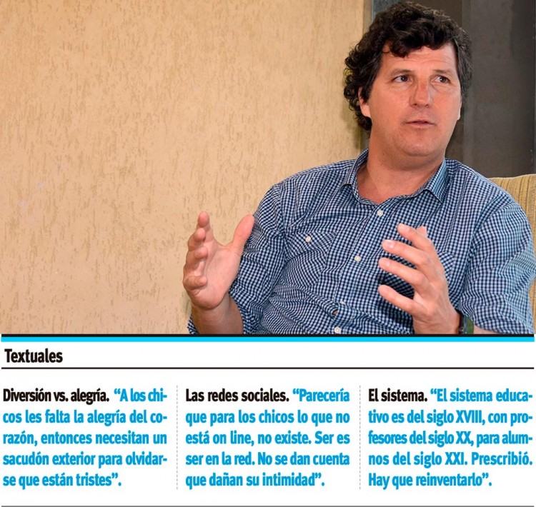 Cómo se divierten los adolescentes es uno de los tantos interrogantes que Eduardo Cazevane, profesor en filosofía, intentará responder en la jornada de Jóvenes y Adolescentes que forma parte del ciclo de Charlas sobre Temas de Familia, organizado por el Centro Judicial de Medicación (Cejume) y el Instituto Público de Capacitación en Resolución Alternativa de Conflictos (IPCRAC) que se llevará adelante hoy en la Universidad de la Cuenca del Plata. Pero primero, el docente habló con PRIMERA EDICIÓN sobre que “la diversión y la alegría no son sinónimos” y que “la diversión está buena pero a veces sobrevaluada”, sobre la importancia de que los padres sean referentes para los hijos, el contenido de las redes sociales y sobre la necesidad de “reinventar” al sistema educativo. ¿Cómo se divierten los adolescentes en la actualidad?Los chicos pasan por ciertos ritos en donde juegan mucho más de lo que ellos creen. Cuando uno les hace ver eso, toman conciencia y pueden cambiar. Primero hay que decirles que no es obligatorio.¿Qué no es obligatorio?Cuando uno les pregunta cómo se divierten, ellos hablan sobre las previas, el abuso de sustancias, sobre que si no hay alcohol no es divertido. Entonces debemos hacerles entender que no es obligatorio. Dicen que el alcohol lo que hace es deshinibirlos, yo les explico que inhibirse no siempre es malo. Que la diversión y la alegría no son sinónimos y que la diversión está buena, pero a veces está sobrevaluada. Divertirse es un momento de extroversión, que están buenos, pero la alegría viene de algo más profundo, del encuentro con el otro. A los chicos les pasa que les falta la alegría en el corazón, entonces necesitan un sacudón exterior para olvidarse que están tristes. Pero cuando se acaban los efectos del sacudón, están más tristes que antes. ¿Cómo eran los adolescentes de antes? ¿Qué cambió a hoy?Lo que hacíamos era lo mismo, lo que cambió es la masividad. Hoy, la frontera de lo que haces no tiene límites. Las redes rompieron las fronteras. Entonces, hay que recuperar el espacio de intimidad. Generar encuentro, diálogo, conversación. Hay que entender las redes sociales, usarlas a favor, pero complementarlas con la presencia real. Lo que hacíamos nosotros era más o menos lo mismo, pero creo que hoy faltan adultos referentes. Hay un grito desesperado de que los padres volvamos a ocupar un lugar del que no sé porqué ni cuándo nos corrimos y hoy estamos tratando de entender cómo volver a posicionarnos. Volvamos de una vez.Justamente se habla de que el padre es amigo y el niño toma decisiones. ¿El padre tiene que recuperar ese poder o hay que escuchar a los chicos?Hay que escucharlos pero debe haber empatía y no ‘empastía’. Tenemos que encontrarnos en un punto medio, porque pasamos de una generación donde la autoridad era muy firme y distante a una linda autoridad cercana. Entonces hay que entender como padres, directivos, comunicadores, lo que significa ser autoridad cercana. Quizá en esta búsqueda de que los chicos no se frustren, nos olvidamos que la frustración es parte fundamental de la educación. Entonces creo que los padres tenemos que volver a encontrar ese lugar, porque lo vamos a disfrutar y porque es un derecho de los chicos. Si no les ponemos límites estamos faltando a un derecho básico y elemental de su vida que es educarse con referentes. Entonces hay pérdida de referencias y como consecuencia, excesos, accidentes. Es hora de que los padres recuperemos nuestro lugar.Trasladándolo al ámbito escolar, los chicos tienen acceso a todo por Google y pueden construir su conocimiento, ¿eso no ayuda a la pérdida de autoridad?Ese es el miedo que hay, pero no. El sistema educativo sigue centrado en contenidos, y esos están al alcance de cualquiera que googlee en Internet, entonces lo que hay que enseñar es mucho más profundo: cómo responder a esta vida, cómo ser, cómo moverme en este mundo. El docente tiene que entender que sigue siendo autoridad, aunque sea cercano. Hoy la autoridad es que yo sé buscar, yo sé preguntarme, yo soy más grande y tengo más experiencia, viví un poco más que vos pero que también me animo a aprender de vos y aprender con vos y juntos. Hay que resignificar la escuela y reinvertarla. Lo que conocíamos, prescribió. No es que no haya autoridad, es que cambió el modo de autoridad. El vínculo a la hora de aprender, ¿es fundamental, genera el proceso de aprendizaje?No hay aprendizaje verdadero sin vínculo. Nadie aprende si no se siente querido, respetado, amado, motivado. No hay otra cosa hoy. Por eso digo que antes la educación estaba basada en el saber, hoy está basada en el vínculo. Un profesor que le pone pasión a lo que enseña contagia al alumno a aprender. El docente tiene una posibilidad enorme de generar en el otro la autoconfianza y de orientar, mostrar el camino. Orientar viene de oriente que es donde nace el sol. Te muestro de dónde nace el sol que a mí me ilumina y me da calor, para que vos encuentres el tuyo propio. ¿Es así el sistema educativo argentino?No. Pero hay muy buenos docentes que logran generar en el alumno la capacidad de superación. En realidad, es una crisis mundial: el sistema educativo prescribió, es del siglo XVIII, con profesores del siglo XX, para alumnos del siglo XXI. Hay que reinvertarlo. El tema es que no lo va a reinventar la política, lo vamos a hacer quienes estamos en el aula y nos tenemos que animar. Hablaba de generar un pacto educativo de acá a veinte años…Sí, porque un gobierno dura cuatro años, la educación es veinte mínimo. Si lográramos un acuerdo de organizaciones, partidos políticos, movimientos vecinales, empresas para dar libertad y los que están en el aula puedan trabajar con formas nuevas, distintas y busquen… pero que no venga el gobierno siguiente y vuelva a cambiar. Yo creo que se necesita un pacto educativo que deberíamos reclamar pero también soltarn