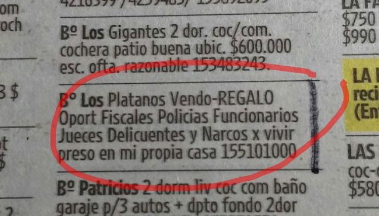 “Vendo-regalo. Oportunidad, fiscales, policías, funcionarios, jueces, delincuentes y narcos por vivir preso en mi propia casa”, fue el anuncio que Adrián Bucarini, de barrio Los Plátanos, puso el domingo 9 en los clasificados de La Voz para  dar a conocer su calvario.Cansado de la inseguridad que experimenta todos los días, decidió hacerle caso al consejo que le dio un comisario y poner a la venta la casa que compró con mucho esfuerzo hace 20 años.“Hice todas las denuncias correspondientes y nunca obtuve respuestas”, detalló Bucari y añadió: “Se ha naturalizado el delito. La Policía dice que no puede solucionar el problema en la zona. Los vecinos dejan sus casas y se van. Los inquilinos que desconocen la situación y llegan con sus familias están pocos meses y también se terminan yendo por los robos”.El hombre, que vive solo, sostuvo que conoce a los ladrones que operan en la zona. “Se hacen llamar la banda del fondo”, detalló.Según su relato, no hay presencia policial en el barrio. “No existe en ningún momento del día”, concluyó.