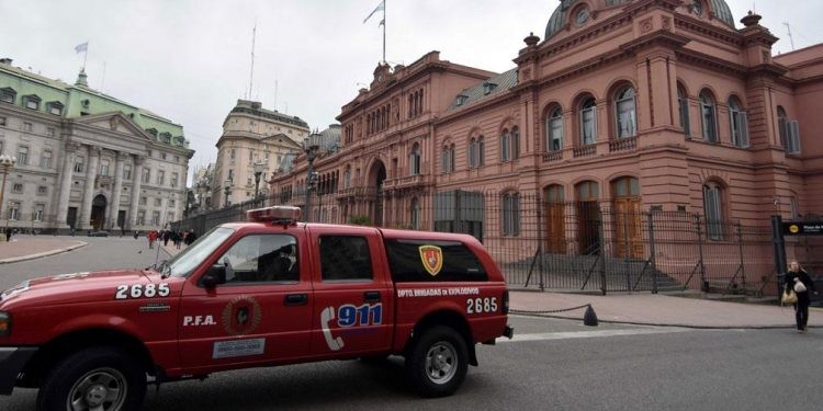 El hecho sucedió este mediodía cuando en la línea 911 de la provincia de Buenos Aires recibieron un llamado anónimo que daba cuenta de la presencia de un artefacto explosivo en la Casa Rosada, por lo cual se ordenó una inmediata inspección a cargo de la Policía Federal.Sin evacuar el edificio, los expertos realizaron la tarea y descartaron la presencia de algún tipo de explosivo dentro de la Casa de Gobierno.El episodio se suma a otras dos amenazas registradas en las últimas horas, una de ellas contra la gobernadora bonaerense, María Eugenia Vidal, y otra contra el gobernador jujeño, Gerardo Morales.La amenaza de bomba se produjo en momentos en que el presidente Mauricio Macri se encuentra en Roma para reunirse mañana con el papa Francisco y asistir el domingo a la ceremonia de canonización del cura Brochero.Fuentes policiales indicaron que la investigación del hecho recayó en el juzgado federal a cargo de Rodolfo Canicoba Corral, según publica Nexofin.