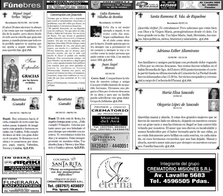 Fúnebres del domingo 16 de octubre de 2016