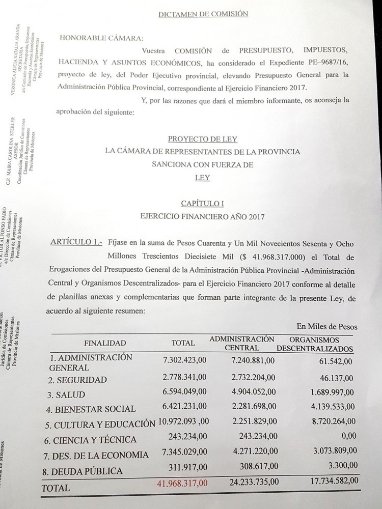 El dictamen también incorporó las partidas para leyes recientemente aprobadas como el Banco de Prótesis, el Programa Provincial de seguimiento al recién nacido, el Instituto Forestal Provincial, las becas Andrés Guacurarí, la Ley de Contención a personas Transplantadas, entre otras, además de incrementos presupuestarios para el Tribunal de Cuentas, el ministerio de Gobierno y Desarrollo Social. Respecto de la limitación de la posibilidad de que el Ejecutivo disponga de la reestructuración y cambio de partidas, se estableció que podrá hacerlo solo hasta el 20%. Quedan excluidos de la limitación el Poder Judicial, el Tribunal Electoral y el Tribunal de Cuentas. El tratamiento del Dictamen está previsto para este jueves en la sesión ordinaria de la Cámara de Diputados.