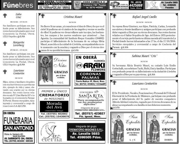 Fúnebres del miércoles 19 de octubre de 2016