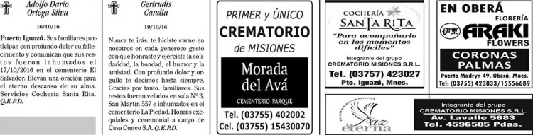 Fúnebres del jueves 20 de octubre de 2016