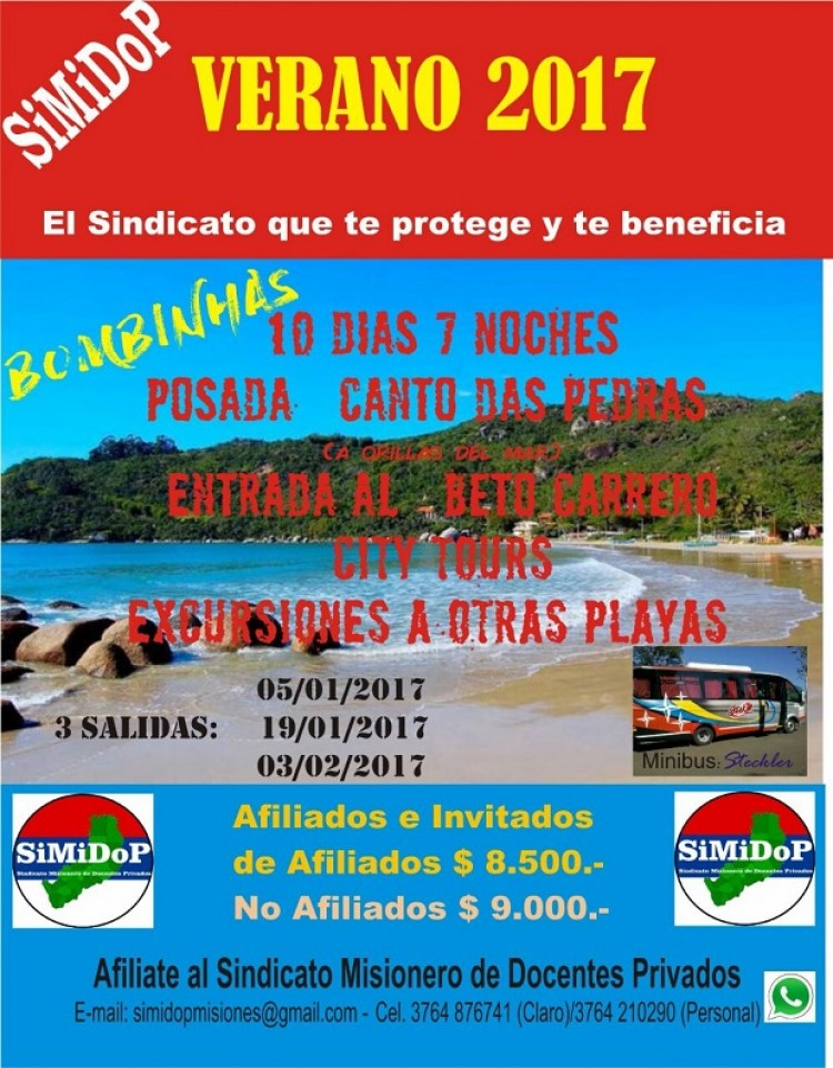 El Sindicato Argentino de Docentes Privados (Sadop) denunció el accionar de algunas personas que se presentan como referentes de un sindicato docente y que promocionan paquetes turísticos para los educadores dentro de los colegios de gestión privada. Días atrás, Sadop pidió al Servicio Provincial de Educación Privada de Misiones (SPEPM) que advierta sobre esta situación a los representantes legales de las instituciones educativas, pero hasta el momento el organismo no emitió ninguna circular o notificación al respecto. Según indicó la secretaria general de Sadop, Fabiana Flores, “nuestra entidad tomó conocimiento que un grupo de personas, que se identifican como supuestos ‘representantes sindicales’, han venido realizando acciones y reuniones en el interior de los establecimientos privados adscriptos al sistema, ello con autorización de los directivos y utilizando una calidad o status mentido. En esas reuniones se identifican como Sindicato Misionero de Docentes Privados (Simidop) y ofrecen servicios turísticos a los docentes y se aprovechan de la confusión de los colegas, quienes los identificaban en el pasado como integrantes del Sadop”.Al respecto, la dirigente señaló que “esas personas no pertenecen desde hace tiempo a la entidad sindical que dirijo y vale aclarar que no existe en el ámbito de la provincia un sindicato legalmente constituido con la identificación Simidop. Según pudimos constatar, este grupo pidió iniciar el proceso para ser reconocidos como gremios ante el Ministerio de Trabajo de la Nación, pero ni siquiera cuenta aún con inscripción gremial y mucho menos personería sindical por lo que no pueden presentarse como sindicato”. “Campaña deshonesta”Hasta el momento, según precisó Flores, “los que se presentan como referentes del Simidop realizan ofrecimientos de servicios de naturaleza comercial y particular”. Además, “tal permiso de entrar a las escuelas es también utilizado a fin de desprestigiar y difamar al Sadop, que tiene personería gremial nacional desde hace 63 años, y a sus integrantes, todo en una deliberada intención de revanchismo político que no puede ser tolerado en el ámbito escolar. Incluso, ellos ofrecen a los docentes hacerles el servicio de desafiliación al Sadop pese a que este trámite es personal”. La dirigente señaló además que al menos dos de los docentes que se presentan como referentes de Simidop “tienen licencia por artículo 44, es decir, por enfermedad de largo tratamiento”. Para Flores “esta gente está haciendo una campaña deshonesta basada en un engaño”, opinó.Presentación por las redesHace algunos días, además, comenzó a circular un mensaje en el Whatsapp donde este nuevo grupo sindical cuenta sus inicios: “A mediados de 2015, un grupo de docentes de institutos privados de Misiones realizaron distintas asambleas en Zona Norte, Zona Centro y Zona Capital. En estas, con unos doscientos referentes, decidieron conformar un nuevo espacio de discusión al que dieron por nombre Sindicato Misionero de Docentes Privados (Simidop). La mayoría de los docentes manifestaron en dichas asambleas estar cansados de aportar a sindicatos sordos a los reclamos, vacíos en contenido, ausentes en el interior de la provincia, que no discuten y acatan directivas de otros gremios y de gremios foráneos”, se indica. “En el Simidop queremos hacer total hincapié en lo nuestro, en nuestra realidad misionera, sin depender de dirigencias nacionales, ni regirse por reglas ajenas a nuestra idiosincrasia. Como primer paso, miembros de la comisión organizadora estaremos recorriendo los institutos de la provincia, las EFA y todo establecimiento educativo bajo la órbita del SPEPM, a los fines de escuchar a los colegas y sus inquietudes”, dice el texto que circula en las redes sociales.