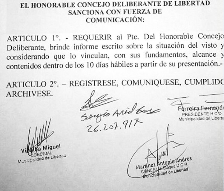 El pasado viernes 6 de mayo se publicó en el Boletín Oficial de la Provincia el decreto Nº 49, firmado el 21 de enero, donde se reconocían desde enero “los servicios prestados” por un grupo de agentes cuyos nombres figuraban en dos planillas anexas, que forman parte del decreto. Además se aprobó “a partir del presente decreto y hasta el 31 de diciembre de 2016, los contratos de locación de servicios con relación de dependencia” entre el Gobierno de la Provincia de Misiones y los agentes que se detallan en las planillas anexas I y II.Para sorpresa de muchos ciudadanos de esta localidad, entre los nombres de la planilla anexa I aparece el de Fernando Ferreira, DNI: 26.207.933, legajo 26.837, categoría 15, hijo del intendente de Puerto Libertad, Luis Ferreira, pero que además es el presidente del Concejo Deliberante de ese municipio.A raíz de esta posible irregularidad, ya que está prohibido tener dos cargos y cobrar doble sueldo del Estado, un concejal presentó esta semana un pedido de informe al Concejo Deliberante.El radical Antonio Andrés Martínez elevó el proyecto relatando que se tomó conocimiento “que el presidente de este cuerpo, concejal Ferreira Fernando, DNI 26.207.933, tendría vinculación laboral con la administración provincial, conforme surge del boletín oficial Nº 14.191, publicado el viernes 6 de mayo de 2016, decreto Nº 49”. “En virtud de mi condición de concejal y a los fines de aclarar cualquier situación que pueda perjudicar el normal funcionamiento de este cuerpo; el objeto de este pedido de informe tiene como fundamento velar por los intereses públicos y respetar derechos otorgados por nuestra constitución nacional”, señala el edil opositor en su proyecto. Martínez agrega que “es imposible la praxis legislativa, más aún la defensa del interés público y sus consecuencias jurídicas directas e indirectas, si no se posee detalle suficiente sobre el ejercicio de nuestros representantes”. También advierte que “los órganos de control y las minorías políticas carecen de elementos para poder dar seguridad de inspección en toda su potencia, sobre el ámbito de ejercicio y competencia que este cuerpo posee”.Además afirma que constituye “un objetivo de este cuerpo velar por la transparencia de los actos de gobierno, a los que permitan un igualitario acceso a la información y a los que amplían la participación de la sociedad en los procesos decisorios de la administración”.Por este motivo se requiere al presidente del Concejo se brinde informe escrito “sobre la situación que lo vinculan, con sus fundamentos, alcances y contenido, en un plazo de diez días hábiles”.