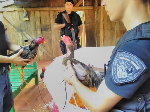 Policías de la comisaría local, dependiente de la Unidad Regional XI con asiento en Aristóbulo del Valle, sorprendió y detuvo por el hecho a Héctor I., de 37 años; Lirio H., de 49; Juan de 44; Mauricio D.A. de 20; Gerardo N. de 30; y Rudimar D.M. de 45.En el mismo procedimiento se incautaron varios gallos con accesorios metálicos punzantes utilizados para pelea (piqueras, púas), además de jaulas para el trasporte de los animales, una carpa de “ring” y un pizarrón con anotaciones de apuestas. En total fueron 24 los animales incautados preventivamente, muchos de los cuales se encontraban en mal estado, mutilados y algunos agonizando como resultado de las peleas. Dichos ejemplares fueron entregados a Bromatología de la Municipalidad de Campo Grande. Los seis detenidos quedaron alojados en la comisaría de Campo Grande, a disposición de la Justicia. Por la riña clandestina, se les instruye un sumario judicial por "malos tratos y actos de crueldad contra animales" (infracción a la Ley 14.346), con intervención de la Justicia Penal de Oberá, y en paralelo otro de carácter contravencional por haberse observado apuestas, relacionada a juegos prohibidos. Fotos: Prensa UR-XI de la Policía