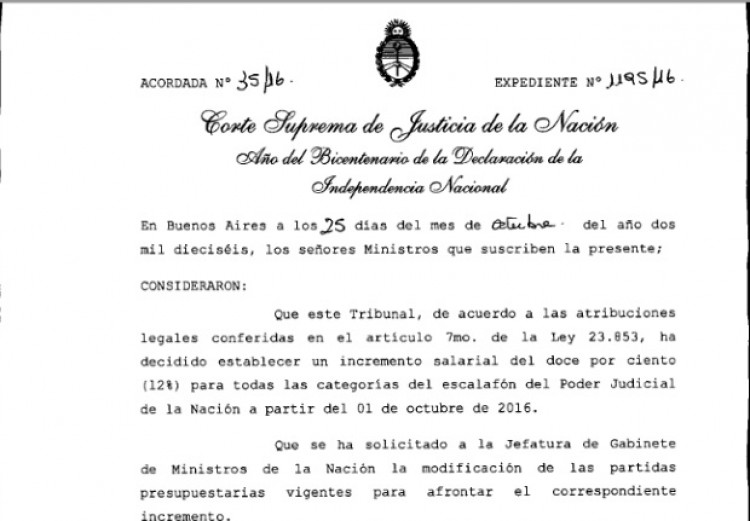 Así lo establece una acordada firmada en la reunión de acuerdos que el máximo tribunal realiza los martes y difundida por su<a href="http://www.cij.gov.ar/nota-23665-La-Corte-Suprema-dispuso-un-aumento-salarial-para-todo-el-Poder-Judicial.html"> sitio oficial www.cij.gob.ar</a>El incremento será “remunerativo y bonificable, para todas las categorías del escalafón del Poder Judicial de la Nación”, y con vigencia desde el primer día del mes en curso.“Se ha solicitado a la Jefatura de Gabinete de Ministros de la Nación la modificación de las partidas presupuestarias vigentes para afrontar rl correspondiente incremento”, señala el breve texto de la acordad 35/16 que rubricaron los cinco integrantes del cuerpo.Fuente: Agencia de noticias Télam