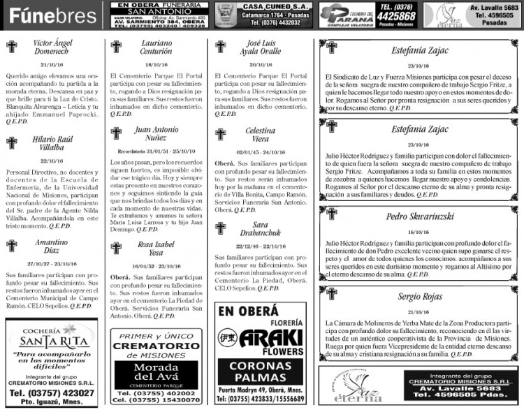 Fúnebres del martes 25 de octubre de 2016
