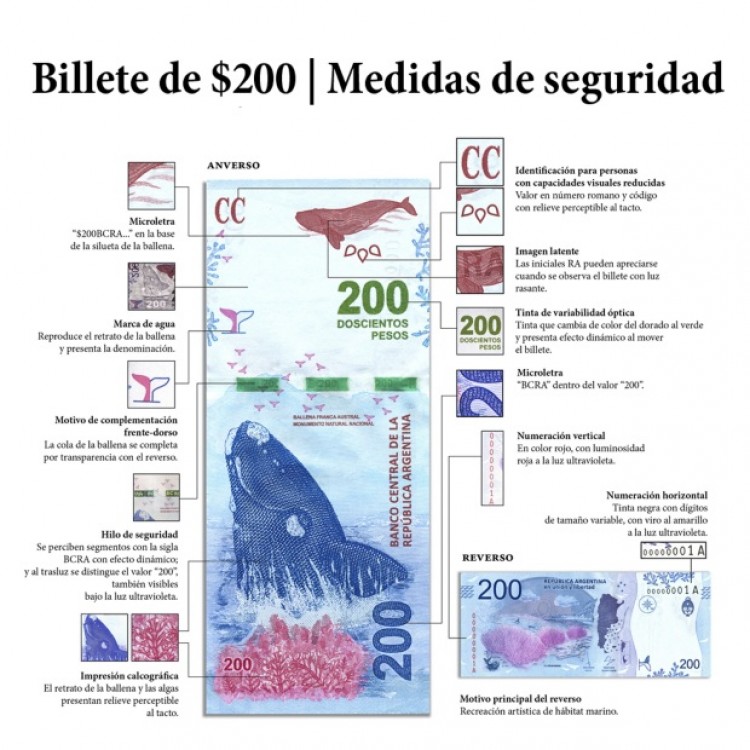 Fue durante un acto que contó con la presencia del gobernador del Chubut, Mario Das Neves; el intendente local, Ricardo Sastre, y autoridades de la Casa de Moneda.El nuevo billete es una pieza que integra la familia de “Animales autóctonos de la Argentina”, y es el resultado de un trabajo al que Sturzenegger definió como “una serie innovadora, armada sobre la base de un billete que se ve vertical y en el que participaron muchos, entre ellos el intendente Ricardo Sastre”.El titular del BCRA recordó que “hay seis ideas simbólicas que quisimos transmitir con esta nueva serie: la primera es la de celebrar la vida, porque hasta ahora eran todos próceres muertos y la idea era cambiar el foco y celebrar lo que está vivo”.“La segunda idea simbólica es que, al representar un ser viviente, invitamos a pensar en el futuro y no en el pasado, en tanto el tercero de los conceptos que queremos es el de quebrar la idea de la solemnidad, con los próceres, porque de esta manera se representa más a la alegría, la vida, la espontaneidad”, dijo.Sturzenegger señaló además que “el cuarto concepto a recrear es el federalismo, porque salimos de ese país del Buenos Aires céntrico para pisar fuerte en todo el territorio con el yaguareté del noreste para el billete de 500 pesos, el guanaco patagónico oeste para el de 20 pesos, el cóndor de la cordillera para el de 50 pesos, la taruca para el de 100 pesos, el de 1.000 pesos para el hornero que representa al país del centro y el de 200 pesos, con la ballena, que nos convoca hoy”.También enumeró que “la quinta idea fuerza es reforzar la ecología, la sustentabilidad, la idea que el país no somos sólo humanos y nuestra responsabilidad es con todos ellos, con el ecosistema; y el último es el de encontrarnos los argentinos con una representación donde todos nos sintamos parte sin ningún tipo de resquicio, todos nos sentimos parte de esta agenda de la sustentabilidad, y nos pareció que era una buena forma salir de los históricos o políticos para encontrar plataformas para trabajar juntos”.El nuevo billete tiene en cuenta diversos elementos de seguridad, no sólo de la marca de agua sino los hilos milimétricos que lo surcan; la técnica de grabado calcográfico; el motivo de complementación frente-dorso y el detalle para la manipulación de personas con capacidades reducidas.Fuente: Agencia de noticias Télam