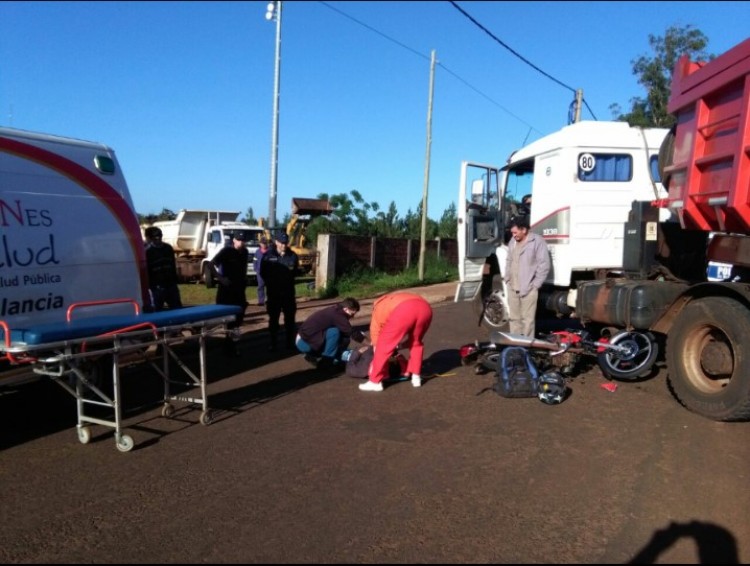Una motocicleta Zanella RX conducida por Andrés M. (32), por causas que son materia de peritaje colisionó con un camión Mercedes Benz al mando de José P.(54). A raíz del impacto el motociclista terminó con lesiones y fue trasladado al Hospital Madariaga donde se aguarda parte médico. La Policía Científica y la comisaría seccional 15ta intervinieron en el lugar.