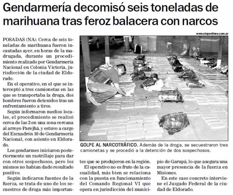 La fiscal federal de Eldorado, Liliam Delgado, solicitó la elevación a juicio de la investigación seguida contra Diego Genaro Britos (35), acusado de transportar marihuana a bordo de una camioneta Toyota Hilux y acumular en una vivienda del paraje Parehá, en Colonia Victoria.A la altura del kilómetro 1.554 de la ruta nacional 12, durante la madrugada del 9 de abril de 2015, integrantes de las secciones “Núcleo”, “Montecarlo” y “Esperanza”, dependientes del Escuadrón 10 “Eldorado” de Gendarmería Nacional patrullaban el área cuando advirtieron una camioneta que iba y venía por la ruta, hasta detenerse detrás de una vivienda precaria a la altura del km 1.554, sobre el camino terrado que conduce al río Paraná.Los gendarmes advirtieron que tres hombres hacían señales lumínicas desde la vivienda, al tiempo que escuchaban el avance de otras dos camionetas: una Toyota Hilux y una Ford Ranger –que tenía pedido de secuestro por haber sido robada- cuyos tripulantes abandonaron los vehículos y huyeron a pie al ver la patrulla de Gendarmería. Al inspeccionar los vehículos, los gendarmes advirtieron que trasladaban marihuana.Ante esto, se dirigieron hacia la vivienda, en cuyo fondo encontraron la otra Toyota Hilux que era conducida por Britos, nacido en Formosa. Personal de la sección “Montecarlo” rastrilló la zona y encontró varios montículos de paquetes similares a los encontrados en las camionetas abandonadas.El peritaje efectuado por los especialistas de la Gendarmería Nacional estableció que transportaban una carga de 6.312,06 kilogramos de marihuana, diseminada en 6.406 panes o ladrillos dentro de 288 bolsas plásticas.Para la fiscal Delgado, Britos debe ser juzgado como coautor del delito de “transporte de estupefacientes”. La representante del Ministerio Público también solicitó profundizar la investigación para identificar a las demás personas que participaron en el transporte de estupefacientes, como también para conocer el origen de la camioneta Ford Ranger.
