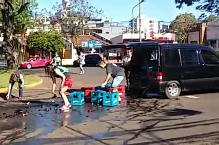 Pasadas las 16:30 de este sábado, una Peugeot Partner que circulaba sobre la avenida Corrientes sufrió -al llegar a la esquina de Tambor de Tacuarí y por razones desconocidas hasta el momento- la apertura de sus puertas traseras, lo que provocó el vuelco de buena cantidad de la carga que llevaba, más precisamente cajones de cerveza con numerosas botellas en su interior.Como consecuencia de ello, el asfalto se convirtió en un reguero de vidrios que afectaron la circulación por la zona por espacio de varios minutos.Además, gran cantidad de curiosos se agolpó en la zona, entre chistes y lamentos por la bebida derramada.Imágenes: Gentileza Daniel Rosas