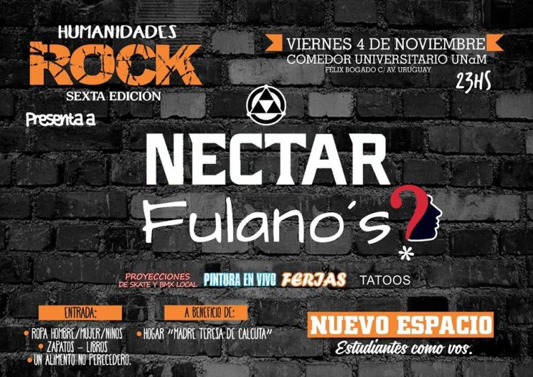 Humanidades Rock es uno de los eventos más grandes de la Universidad Nacional de Misiones y en la oportunidad harán su presentación sobre el escenario NÉCTAR y Fulano´s. Además se realizarán pinturas en vivo, tatoo, y proyecciones de skate y BMX local. La entrada es un alimento no perecedero, ropas y colchones. La actividad es organizada por la agrupación estudiantil Nuevo Espacio que año tras año trabaja en este evento a beneficio. En esta edición lo recaudado será a beneficio del Hogar Madre Teresa de Calcuta de la ciudad de Posadas.