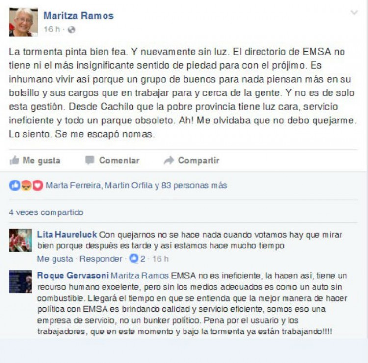 Se trata de Maritza Ramos, directora ejecutiva del Instituto de Formación para la Gestión Pública (Infogep) de la provincia de Misiones y una de las representantes del Instituto Misionero de Estudios Superiores (Imes).Aproximadamente a las 20 del martes, cuando la tormenta se acercaba a la ciudad, la funcionaria escribió en su cuenta de Facebook: “nuevamente sin luz. El directorio de Emsa no tiene ni el más insignificante sentido de piedad para con el prójimo. Es inhumano vivir así porque un grupo de buenos para nada piensan más en su bolsillo y sus cargos que en trabajar para y cerca de la gente”.“Y no es de solo esta gestión. Desde Cachilo (Rodríguez, expresidente y actual secretario general de Luz y Fuerza) que la pobre provincia tiene luz cara, servicio ineficiente y todo un parque obsoleto. Ah! Me olvidaba que no debo quejarme. Lo siento. Se me escapó nomas”, remató con ironía. Muchísimos funcionarios piensan igual pero no tienen el valor de manifestarlo. Mientras tanto, el clossista Sergio Ferreira fue ratificado en la presidencia de Emsa.