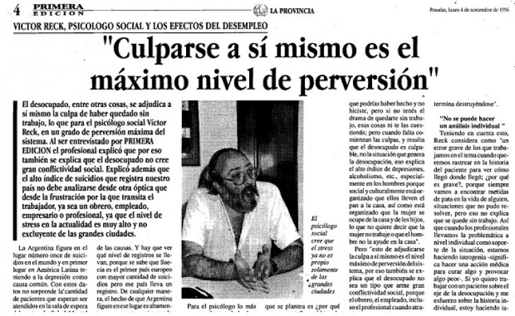 (Nota completa publicada el 4 de noviembre de 1996)El desocupado, entre otras cosas, se adjudica a sí mismo la culpa de haber quedado sin trabajo, lo que para el psicólogo social Víctor Reck es un grado de perversión máxima del sistema. Al ser entrevistado por PRIMERA EDICIÓN, el profesional explicó que por eso también se explica que el desocupado no cree gran conflictividad social. Explicó además que el alto índice de suicidios que registra nuestro país no debe analizarse desde otra óptica que desde la frustración por la que transita el trabajador, ya sea un obrero, empleado, empresario o profesional, ya que el nivel de stress en la actualidad es muy alto y no excluyente de las grandes ciudades.La Argentina figura en el lugar número once de suicidios en el mundo y en primer lugar en América Latina, teniendo a la depresión como causa común. Con estos datos no sorprende la cantidad de pacientes que esperan ser atendidos en la sala de espera del sector de Salud Mental del Hospital Madariaga."Sí, es preocupante lacantidad de suicidios que hay en nuestro país" -admite el psicólogo social Víctor Reck-y la depresión a la que lleva la desocupación puede ser una de las causas. Y hay que ver qué nivel de registros se llevan, porque se sabe que Suecia es el primer país europeo con mayor cantidad de suicidios pero ese país lleva un registro. De cualquier manera, el hecho de que Argentina figure en ese lugar es altamente preocupante, y si a eso le agregamos los suicidios no computados como tales: adolescentes que se matan con motocicletas, o los que manejan un auto a 200 kilómetros por hora, por ejemplo, seguramente el número asciende".Para el psicólogo, lo más grave en el tema de la desocupación es la culpa que se adjudica el desempleado. Recordó el caso de un hombre de más de 50 años, plomero, que trabajó toda su vida y que de golpe no tuvo más empleo. "Lo primero que se plantea es ¿por qué me pasa esto?, ¿qué hice de malo? Va a la iglesia, pide perdón a Dios, entonces, la causa que es externa inmediatamente la lleva como si fuera una cuestión suya, de culpa. En la cadena de tu vida siempre hay cosas que podrías haber hecho y no hiciste, pero si no tenés el drama de quedarte sin trabajo, esas cosas ni te las cuestionás; pero cuando falta comienzan las culpas, y resulta que el desocupado es culpable, no la situación que genera la desocupación, eso explica el alto índice de depresiones, alcoholismo, etc., Especialmente en los hombres, porque social y culturalmente está organizado que ellos lleven el pan a la casa, así como está organizado que la mujer se ocupe de la casa y de los hijos, lo que no quiere decir que la mujer no trabaje o que el hombre no la ayude en la casa".Pero "esto de adjudicarse la culpa a sí mismo es el nivel máximo de perversión del sistema, por eso también se explica que el desocupado no sea un tipo que arme gran conflictividad social, porque el obrero, el empleado, incluso el profesional, cuando atraviesan un problema laboral, supuestamenten tiene un enemigo contra el cual se enfrentan; el culpable está afuera y pueden pelear contra él, entonces se organizan, hacen manifestaciones, protestan; en cambio, el desocupado se adjudica la culpa, no se puede organizar, se aisla, primero de su núcleo social, después de sus amigos, de su familia y termina destruyéndose"."No se puede hacer un análisis individual"Teniendo en cuenta esto, Reck considera como "un error grave de los que trabajamos en el tema cuando queremos rastrear en la historia del paciente para ver cómo llegó donde llegó; ¿por qué es grave?, porque siempre vamos a encontrar metidas de pata en la vida de alguien, situaciones que no pudo resolver, pero eso no explica que se quede sin trabajo. Así que cuando los profesionales llevamos la problemática a nivel individual como soporte de la situación, estamos haciendo iatrogenia" (significa hacer una acción médica para curar algo y provocar algo peor). "Si yo quiero trabajar con un paciente sobre el eje de la desocupación y me esfuerzo sobre la historia individual, estoy haciendo iatrogenia, le doy más culpa todavía. Tengo que tomar eso como un accidente, como algo que tiene que ver con la situación actual pero que no es lo determinante. Lo sería si el índice de desocupación fuera del uno por ciento, pero cuando la desocupación abarca al 50 por ciento de la gente, no se puede hacer un análisis individual".Círculo viciosoVíctor Reck sostiene que la falta de empleo genera un círculo vicioso: "La persona se queda sin trabajo, comienza a buscar, se cansa, se deprime, se aísla entre otras cosas por los sentimientos de culpa. Es un círculo bastante común. El tema de la desocupación no es sólo del desocupado -asegura-, ya que cambia el horizonte del imaginario social y la desocupación se convierte en un terror. Todos tenemos miedo de que nos echen, eso implica un nivel de temor y angustia terrible". "La desocupación también conlleva bajos salarios, uno no pelea por sus derechos ante el temor de que lo despidan. El imaginario social cambia, la sociedad se torna depresiva, sin fuerzas y generalmente se tiene a suplantar esta situación con otras cosas: el alcohol, la droga, lo que sea. Hay una gran falta de solidaridad, porque nosotros estamos educados en el trabajo como organizador. El trabajo es clave: ahí se juega la vocación, la manutención, los valores; y cuando ese organizador entra en crisis, entra en crisis todo. La posibilidad de trabajo implica organización solidaria, lucha, proyectos, futuro. En cambio, el horizonte de la desocupación implica una pérdida del trabajo como eje organizacional, por eso es tan grave".Stress: cóctel explosivoOtro efecto de nuestro tiempo es el stress. En términos sencillos, "el stress es una cantidad de excitación que viene de afuera y de adentro que invade la mente, el sujeto, el aparato psíquico que no se puede elaborar. El estresado recibe perm