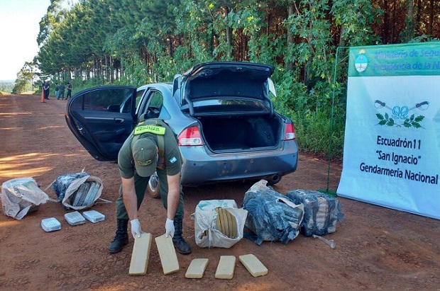 Efectivos de la Sección Jardín América de la Gendarmería Nacional, dependientes del Escuadrón 11 "San Ignacio", secuestraron en las últimas horas un total de 150,213 kilogramos de marihuana que viajaban ocultos en el interior de un vehículo que circulaba por un camino secundario que une la localidad de Colonia Oasis con Jardín América.Los uniformados, que ya estaban alertados sobre un posible traslado de estupefacientes, observaron la aproximación de un vehículo Honda Civic con dos personas a bordo, quienes al advertir la presencia del control, detuvieron su marcha sobre la banquina y se dieron a la fuga por la zona de monte. Inmediatamente, los gendarmes aseguraron la zona y -en presencia de testigos- llevaron a cabo la requisa del vehículo abandonado, detectando que en su interior se acondicionaban cinco bolsas de arpillera con 130 paquetes de lo que resultó ser cannabis sativa. Interviene la Fiscalía Federal de Oberá, que dispuso el decomiso de la droga y del rodado. Asimismo, los funcionarios efectuaron dos allanamientos en Puerto Leoni y Colonia Oasis, donde secuestraron oro vehículo, teléfonos celulares y más elementos de interés para la causa.Fotos: Prensa GN