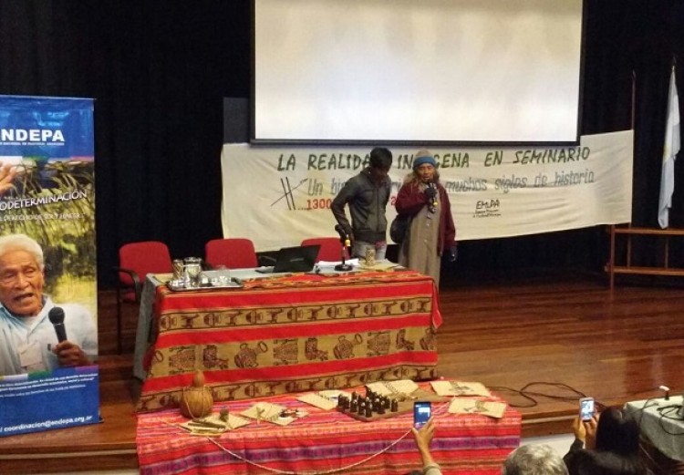 Se desarrolló el sábado en el Salón Auditorium de la Cooperativa Luz y Fuerza de Puerto Rico el octavo Seminario Sobre la Realidad Indígena, organizado por la Pastoral Aborigen de Misiones. La convocatoria fue abierta para todo público y contó con disertadores de gran formación en el tema como el constitucionalista Miguel Ángel Benedetti, el biólogo Raúl Montenegro y Santa Chamorro, referente del grupo de mujeres Jachukavas Neichyro.En la foto, Santa Chamorro con un intérprete de la lengua guaraní.