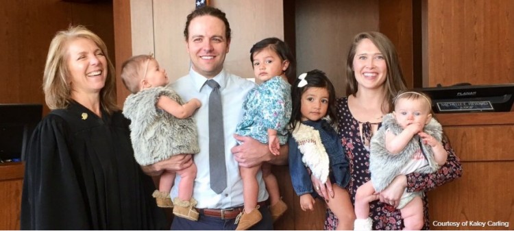 Jeremy y Kaley Carling son ahora padres de cuatro niñas: Haven, de 2, Indie, de 1, y las gemelas de nueve meses Sunny y Welie. La adopción, según contó Kaley a ABC News, fue siempre parte de su plan de vida. De joven, fue diagnosticada con una enfermedad cuya medicación le ha impedido concebir hijos, así que comenzaron el camino de la adopción. Sin embargo, lo hicieron a través de un vientre de alquiler, una experiencia que resultó muy negativa. La madre decidió en el último momento no entregar a su bebé. Kaley reveló que la mujer fue arrestada por tráfico de menores en agosto y los Carling pidieron la custodia de la niña y de su hermano mayor. Por el contrario, las autoridades decidieron entregar a la niña a un familiar. Desgraciadamente, este y la niña fueron asesinados poco después. Curiosamente- indica el sitio T5- el mismo día que a los Carlings les comunicaron el arresto de aquella madre, recibieron una llamada de los servicios sociales anunciando que las hermanas Haven e Indie podían ser adoptadas. Y también ese día, la pareja recibió otra llamada, de una madre de gemelas, diciéndoles que quería darles los derechos sobre sus hijas. Así que el 19 de octubre adoptaron a Haven y a Indie, y un día después a Sunny y Welie, conviertiéndose en una familia numerosa de seis miembros.