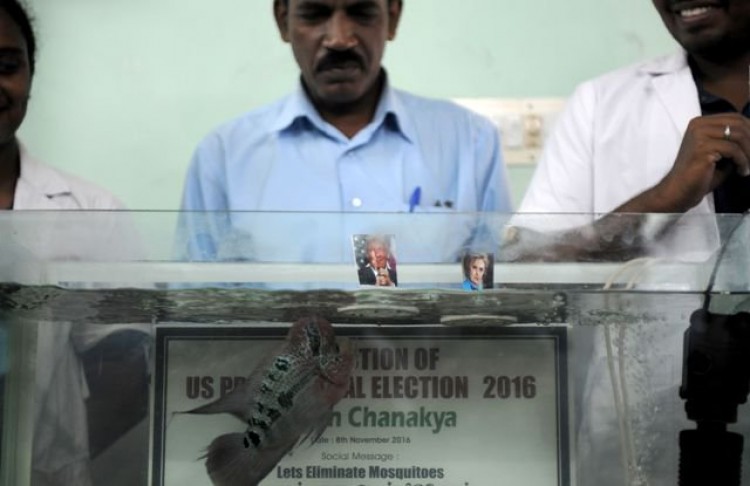 Tras la predicción de un mono chino, un pez indio "médium" pronosticó también este martes la victoria de Donald Trump en las elecciones presidenciales de Estados Unidos. Chanakya II, un cíclido Flowerhorn, que vive apaciblemente en un acuario de Chennai, en el sur de India, tuvo que escoger en tres ocasiones entre dos pequeños recipientes de comida, cada uno de los cuales ornado con una imagen de los dos candidatos a la Casa Blanca. Las tres veces, el pez escogió el recipiente con la fotografía de Donald Trump. Desde que el pulpo Paul predijo con éxito los resultados de ocho partidos seguidos en el Mundial de fútbol de 2010, varios animales con supuestas dotes adivinatorias han sido interrogados durante las grandes competiciones deportivas o para las elecciones. El predecesor de Chanakya II, Chanakya I, alcanzó cierto éxito al predecir con precisión varios resultados de partidos de fútbol y críquet, afirmaron sus propietarios, una oenegé de Chennai. La predicción de Chanakya II sigue a la de este fin de semana del mono chino Geda.El simio, ante dos figuras representando a Donald Trump y Hillary Clinton, se lanzó sobre el candidato republicano y lo besó en la boca. Fuente: Agencia de Noticias AFP-NA