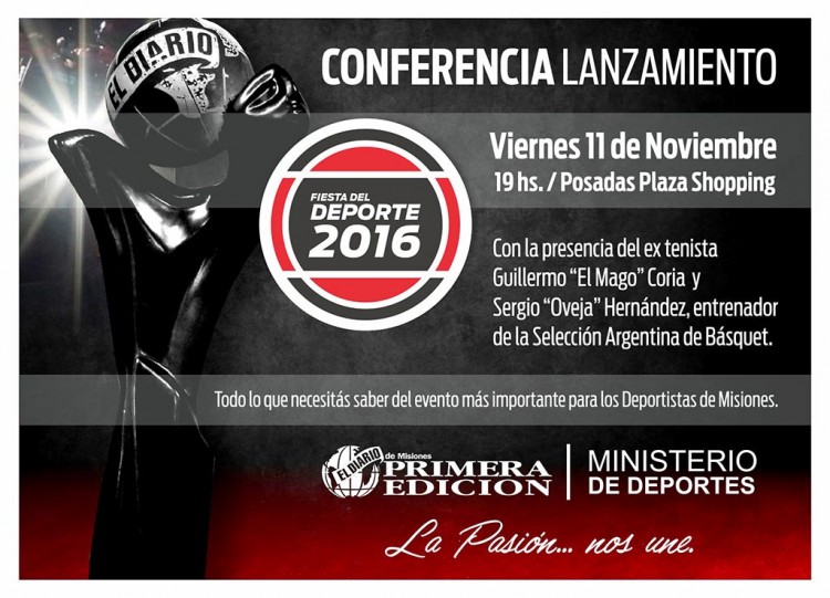 La cita será a las 19, en el Posadas Plaza Shopping, donde acompañarán dicha presentación el extenista Guillermo Coria, el actual entrenador de la selección argentina de Básquet, Sergio Hernández, y el Ministro de Deportes de Misiones, Rafael Morgenstern.Con la expectativa y el compromiso de siempre, PRIMERA EDICIÓN invita a todos los medios, dirigentes y deportistas que quieran acompañar la conferencia para conocer todos los detalles de otra esperada fiesta.
