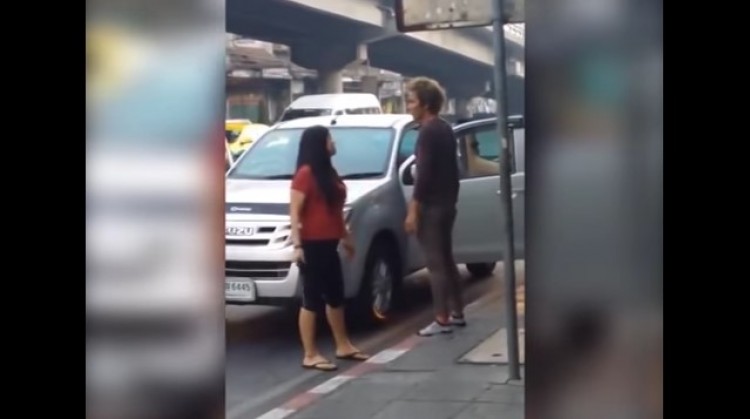 Una mujer muy enfadada llegó en su camioneta hasta una concurrida avenida donde estaba su marido, que se había ido de fiesta toda la noche, y lo obligó a subir al vehículo con un machete.Esto se produjo en la ciudad de Bangkok (Tailandia). Como puede verse en el video, la mujer intentó convencer por las buenas a su marido, pero como este se resistía, la mujer regresó al auto, sacó un machete y se hizo obedecer a la fuerza.Las personas que pasaban por esa concurrida avenida quedaron sorprendidas y una de ellas logró grabar la escena con su celular y posteriormente la compartió en YouTube, donde no tardó en hacerse viral. Fuente:PR