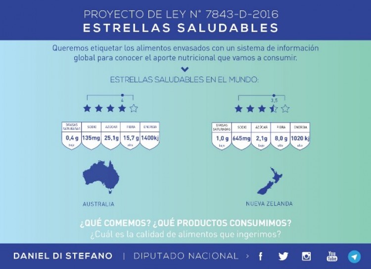 El Proyecto de Ley (Nº Expte.: 7843-D-2016) tiene como novedoso que los envases deberán contar con una calificación simple por medio de un formato denominado “estrellas saludables”. Este nuevo Sistema de Etiquetado Valorativo viene a complementar la información que actualmente se detalla en los alimentos envasados mediante una sencilla y rápida lectura sobre el perfil nutricional. La Administración Nacional de Medicamentos, Alimentos y Tecnología Médica (ANMAT) será la encargada de determinar la calificación de estrellas saludables en base a la calidad de cada producto. Di Stefano remarcó la importancia de que los consumidores de productos alimenticios cuenten con información calificada, clara y fiable de los productos que están a su disposición. Creemos que las empresas que producen y comercializan los productos contribuirán de manera responsable. Por último, destacó que la iniciativa legislativa está enmarcada dentro de lo dispuesto en el Código Alimentario Argentino.