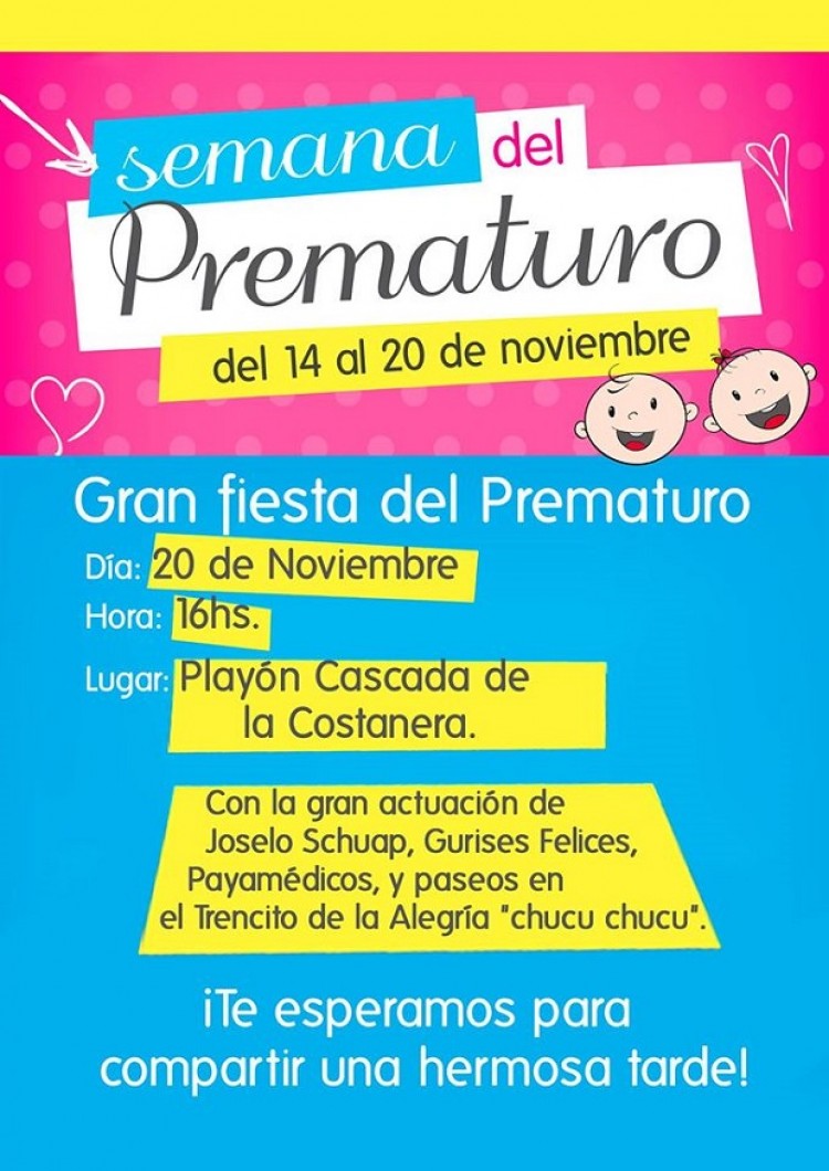 El Hospital Materno – Neonatal invita a la "Gran Fiesta del Prematuro" el domingo 20 de noviembre desde las 16.El lugar elegido es la cascada de la costanera y contará con la presencia de importantes invitados y diversas actividades.Es en el marco de la Semana del Prematuro que se desarrolla en estos días.