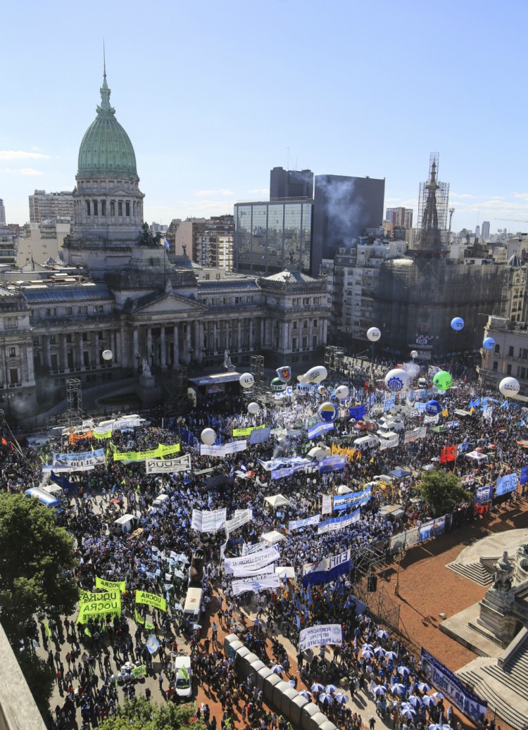 Fue la primera movilización conjunta de la central obrera y organizaciones sociales lideradas por la Confederación de Trabajadores de la Economía Popular (CTEP), Barrios de Pie y la Corriente Clasista y Combativa (CCC), que desbordó el centro porteño en una importante demostración de fuerza. Desde el escenario central montado frente al Congreso, el referente de la CGT Juan Carlos Schmid le reclamó al Gobierno de Mauricio Macri que "abandone la excusa de la herencia recibida y trabaje por una Argentina nueva para todos los argentinos", tras advertir que "el deterioro económico está golpeando la puerta de nuestros hogares"."El deterioro económico está golpeando la puerta de nuestros hogares y nada permite asegurar que vamos a tener en el futuro inmediato una solución: los indicadores económicos no dan ninguna tranquilidad", apuntó, al tiempo que pidió al empresariado "que la termine con los despidos y las suspensiones". "Interpelamos a la clase política a que salga de atrás de los disfraces, que abandone la excusa de la herencia recibida y trabaje por una Argentina nueva", insistió.Por su parte, el coordinador nacional de Barrios de Pie, Daniel Menéndez, advirtió al Gobierno que si se bloquea la eventual ley de emergencia social "el pueblo va a ganar la calle durante todo diciembre repudiando a un Presidente que no se pone en los pies de los trabajadores"."Si se atreve a vetar esta ley una vez más le va a dar la espalda a los trabajadores y los pobres. El pueblo va a ganar la calle durante todo diciembre repudiando a un Presidente que no se pone en los pies de los trabajadores", advirtió Menéndez en referencia a la posibilidad de un veto por parte de Macri.El dirigente reclamó que se sancione la ley de emergencia social porque "los alimentos no paran de subir y encima el Gobierno hizo pelota todas las changas" y agregó: "Acá no queremos más planes sociales. Hay un 40% de la clase trabajadora que vive en la informalidad. Necesitamos ir por nuevos derechos".A su turno, el referente de la CGT Carlos Acuña le advirtió a la Casa Rosada que "se terminaron los tiempos que tenían para gobernar" y reclamó "respuestas concretas" al pedido de ayuda social, tras advertir que la central obrera y las organizaciones "no va a dudar en tomar las medidas que tengan que tomar para que escuchen".Acuña también le reclamó al presidente Macri "que empiece a cumplir con sus compromisos de campaña" y advirtió que en caso contrario es "inútil" la mesa de diálogo que la CGT mantiene con el Gobierno."No puede ser que todos los candidatos se comprometan con cosas para pedir el voto de los trabajadores y humildes, y cuando llegan al gobierno no cumplen. Después de 33 años de democracia nos encontramos como estamos hoy", dijo y agregó: "Esta CGT con los movimientos sociales no va a dudar entomar las medida que tenga que tomar para que nos escuchen. No vamos a aflojar ni un centímetro. Se terminaron los tiempos que tenían para gobernar ¡Queremos respuestas ya!", advirtió.El proyecto que declara la Emergencia Social fue aprobado el miércoles pasado en el Senado y, entre otras cosas, promueve la creación de un millón de puestos de trabajo, la fijación de un Salario Social Complementario y un aumento del 15 por ciento en el monto de las Asignaciones por Hijo y Embarazo.Sin embargo, en Diputados la iniciativa será frenada por decisión política del oficialismo debido al costo financiero que implicaría: se niega a tratarlo en comisión e incluso impondrá su número para bloquear un eventual pedido para que sea abordado en una sesión especial.Fuente: Agencia de Noticias NA