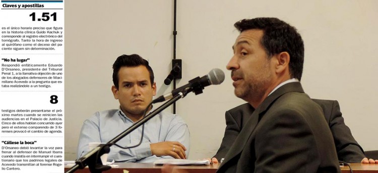 Tres profesionales del Cuerpo Forense del Poder Judicial de Misiones declararon ayer en la sexta jornada de debate oral por la muerte de Guido Martín Kachuk (17), que se desarrolla en el salón de usos múltiples del Palacio de Justicia y que tiene tres acusados, por “homicidio y robo en grado de tentativa”, Ricardo Ríos y Maximiliano Acevedo, y el médico Manuel Ibarra por “homicidio culposo”.Los relatos de Rogelio Canteros, Carlos Wolheim y Juan Antonio Galuppo fueron extensos y detallados sobre los análisis y estudios realizados a la historia clínica y a las imágenes de la autopsia al cuerpo del adolescente. La audiencia se inició a las 8.30 y hasta las 14 se prolongó, por lo que los cinco testigos que no pudieron comparecer deberán regresar el próximo martes cuando se reinicie el debate.Canteros remarcó varios puntos polémicos que surgieron del informe en cuanto al cuadro de gravedad de Kachuk al ingresar al hospital Ramón Madariaga durante la madrugada del martes 22 de febrero de 2011. Insistió que a la víctima debieron practicarle “una punción porque tenía el abdomen tenso y hay que explorar la zona (…) Era lo mínimo e indispensable que se debió hacer en la evaluación”. Señaló que una “laparotomía también correspondía, en realidad un montón de cosas se pudieron haber hecho, una radiografía, ecografía…”.Fue consultado por la fiscal Liliana Mabel Picazo sobre si la intoxicación con alcohol habría provocado abdomen tenso en la víctima, tal como lo declaró Ibarra en la primera jornada de juicio. “No, el alcohol no pone tenso el abdomen y el aliento alcohólico está presente en el paciente y es fácilmente identificable”. Aseguró que “se imponía llevar al quirófano” a Guido Kachuk y que fue “lenta la evaluación, por ello el resultado fue el óbito (muerte)”. “Cuanto antes se actúa, menos sangre se va a perder y aumentan las chances de sobrevida”. “A lo sumo veinte minutos o media hora de evaluación se necesitaba. Del ingreso al quirófano hubo lentitud frente al ritmo de descomposición que presentaba el paciente, fue excesivo el tiempo utilizado”.Marcó como una irregularidad que, en el informe o historia clínica de la víctima, “tampoco constan las medicinas que se necesitaron para la reanimación cariorrespiratoria. “Sólo atropina o dopamina fueron registradas”. “Las drogas lo hubieran ayudado a mantener el flujo de sangre, eran necesarias”.Cuestionó también que le hayan suministrado haloperidol para calmar la excitación motriz que manifestaba Kachuk: “Antes de ello hay que identificar el motivo de la excitación, esta droga puede tapar el examen (al paciente). En una emergencia yo no lo utilizaría”. Frente a la discusión referida a la gravedad de la lesión, si era irreversible de todas maneras la muerte, el forense subrayó: “Mientras está vivo, siempre hay chances de salvarlo”.También tocó otro punto determinante del informe, el horario de ingreso al quirófano luego que se detectara la bala en la región lumbar de Kachuk: “No consta la hora de ingreso a quirófano, sólo la hora de la tomografía, 1.51”.También opinó que ante el nivel 13 de hematocritos que presentaba Kachuk, cuando el normal es 40-45, “era necesario trasfundir sangre, pero primero evaluar la lesión”.Canteros fue concluyente antes de finalizar o resumir su labor: “Se puede incurrir en mala praxis sobre un moribundo si se aplican mal las medidas”.“Hay que ir a quirófano” El segundo forense en declarar fue Carlos Wolheim, quien realizó un estudio similar al de Cantero sobre los informes que obran en la historia clínica del hospital Madariaga. Resaltó que “la herida de Guido debía ser visualizada” y que “si había líquido en el abdomen hay que ir al quirófano para sacarlo (…) En este caso, el paciente tenía conducta quirúrgica desde el vamos (…) Y la respuesta inmediata genera chances, probabilidades de vida. Cada minuto vale oro y marca la diferencia entre la vida y la muerte. En el retardo del diagnóstico (Guido) perdió las chances”. “Si iba directamente al tomógrafo las posibilidades iban a ser mayores ante una herida gravísima”. No soslayó como irregularidad en la historia clínica la ausencia de horario de ingreso tanto al shock room de Emergencias, como al quirófano y la culminación de la intervención del cirujano. “Como horario de finalización de la anestesista figura las 4 de la mañana y no está claro a que hora comenzó la operación”. El perito restante -y también de irrefutable trayectoria- Juan Antonio Galuppo describió las fotografías tomadas en la autopsia y ratificó que el disparo dejó en la espalda de Kachuk el “halo de Fisch”, la marca del ingreso de la bala, que este caso correspondió a un calibre 22.