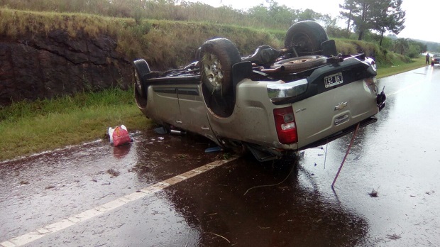 El percance se registró a las 11:00 de este domingo en el kilómetro 840 de la arteria nacional, por donde circulaba una camioneta Chevrolet S10 al mando de Ricardo B. (60), acompañado por su esposa Mabel D. S. (40) y su hija de 10 años.En un momento dado, el conductor perdió el control del rodado, despistó y quedó en posición invertida en el carril contrario. A raíz del hecho, la mujer de 40 años fue examinada por el médico policial en turno y se determinó que sufrió fractura de clavícula derecha, por lo que quedó hospitalizada, en tanto que el resto de los participantes resultaron ilesos. En el lugar trabajaron efectivos de la comisaría de Alem y de la Policía Científica, que investigan las causas del incidente vial.Fotos: Policía de Misiones