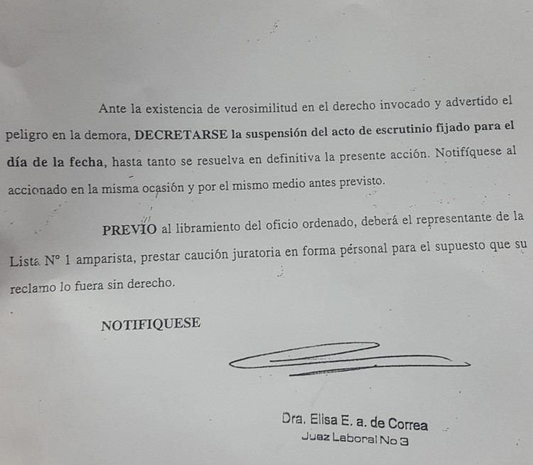La jueza laboral Elisa Correa, titular del juzgado laboral 3 de Posadas, admitió el recurso y ordenó la suspensión del escrutinio hasta tanto se resuelva la cuestión de fondo referida a las <a href="http://www.primeraedicion.com.ar/nota/235274/denuncian-irregularidades-en-las-elecciones-de-docentes.html">irregularidades antedichas</a>. Los apoderados del FUTE notificaron a la Junta antes de las 13, pese a lo cual hay rumores de que el conteo definitivo de los votos se desarrollará de igual manera, situación calificada como "gravísima" por los amparistas que lograron la orden judicial.  Los referentes de las listas 1 y 11 para las ramas primaria y secundaria venían denunciando hace un mes las manipulaciones del padrón de docentes y las <a href="http://www.primeraedicion.com.ar/nota/235498/el-fute-advierte-sobre-presunta-estafa-por-interinos-con-horas-en-es.html">maniobras del día de las elecciones</a> que posibilitaron el voto de personas no habilitadas según el Decreto reglamentario del acto eleccionario.  u000AEn la escuela 813 del Centro Cívico se notó fuerte presencia policial. Allí había convocado a sus adeptos la dirigente renovadora Stella Maris Leverberg “para defender los votos”. Finalmente, ante la contundencia de la medida cautelar ordenada por la jueza, la secretaria general de UDPM decidió dejar sin efecto la movilización. Un amparo no es un triunfo, es sólo una medida cautelarAsí es el título del comunicado de prensa que envío la Agrupación ADOMIS. A continuación el texto completo:Así lo expresaron dirigentes, militantes y candidatos de la Agrupación de Docentes de Misiones (ADOMIS) y del Frente de Trabajadores de la Educación de Misiones (FRETEMIS) y lamentaron la judicialización de las elecciones docentes, propiciada por quienes ya han perdido las elecciones por decisión de la mayoría de los docentes misioneros, tanto en primaria como en secundaria. Atentar permanentemente contra la legítima democracia, como ya lo hicieran en elecciones de UDPM, IPS, CTA y lo único que consiguieron fueron las prórrogas de mandatos de quienes están y estaban en aquel momento, y la posición final del proceso judicial siempre fue a favor de la verdad, ya que NUNCA les dio favorables a ellos.Perdidosos y violentos, ya que amenazaron cuando decidimos apersonarnos en la junta electoral en la tarde de este lunes, siguen demostrando la falta de respeto por el colectivo docente, despreciando a quienes no piensan como ellos y deslegitimando los derechos de los trabajadores de la educación, que en paz y camaradería asistieron a emitir su voto. Un amparo no es un triunfo, es sólo una medida cautelar que suspende el escrutinio definitivo hasta que un juez cuente con los elementos necesarios para la resolución del supuesto conflicto. Cabe aclarar que esta medida cautelar puede perdurar en el tiempo por lo que hasta la resolución definitiva en el Superior Tribunal de Justicia, continuarán los mismos vocales en el CGE y la Junta, tal la propuesta del FRETEMIS (sólo un Vocal en Junta secundaria se modifica), así que Arnaldo Idzi y Marcelo Marquez continúan en el CGE; Hilda Radke, Marlene Da Luz, Mónica Arrúa en Junta primaria; y Bienvenida Pereira con Laura Hereter continuarán en funciones mientras dure este proceso y renueven los mandatos quienes ganaron con votos docentes (y no con la justicia), desde la lista 2 y 22.