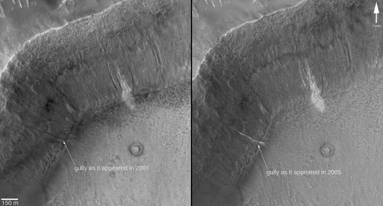 La Administración Nacional de la Aeronáutica y del Espacio de Estados Unidos (Nasa) publicó el 6 de diciembre de 2006 fotos de la “Mars Global Surveyor” (MGS) que sugieren la presencia de agua en Marte. El descubrimiento donde se puede ver las zanjas dibujadas por el agua fluyendo en las laderas de los cráteres del planeta rojo se publicó en la revista “Science”. Las fotografías tomadas en 2004 y 2005 por la MGS muestran dos depósitos de sedimentos brillantes situados en laderas de cráteres que sugieren que el agua habría arrastrado material en algún momento durante los últimos años. En 2004, los vehículos de la Nasa “Spirit” y “Opportunity” aportaron pruebas de que una vez, hace miles de millones de años, hubo una “sopa” salada y ácida de agua cubriendo parte de la superficie marciana y que en ese medio se dieron las condiciones ambientales adecuadas para la aparición de la vida. La misión Mars Global Surveyor fue la primera en 20 años en llegar con éxito al planeta rojo.