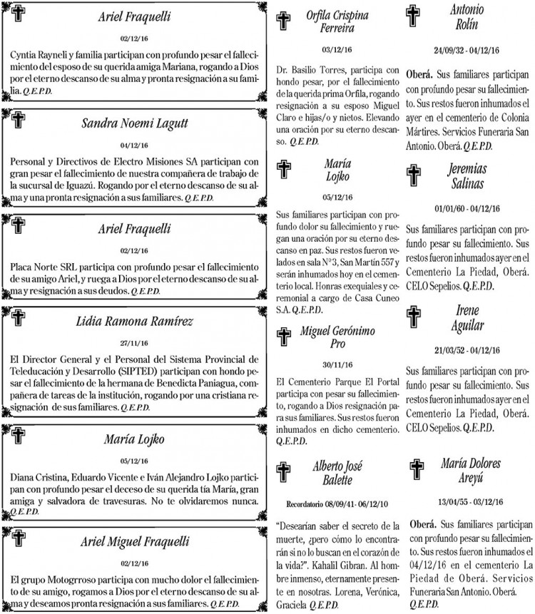 Fúnebres del martes 6 de diciembre de 2016