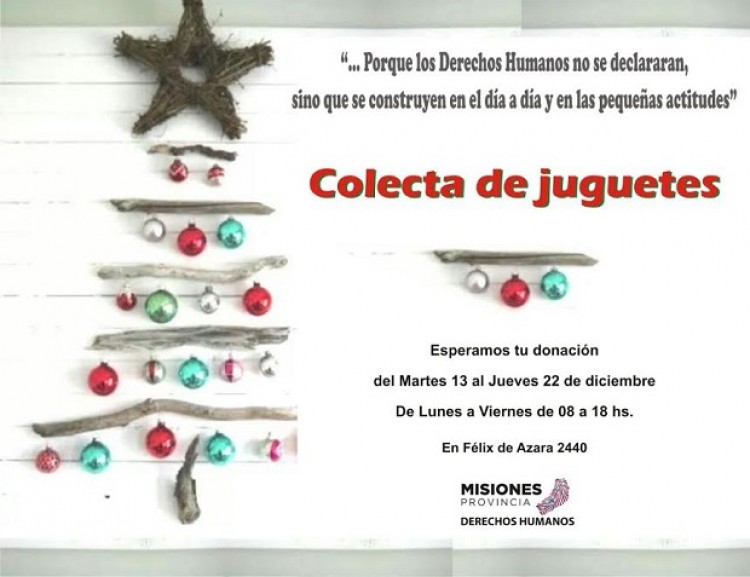 <p>Las donaciones podrán acercarse hasta el 22 de Diciembre a Félix de Azara N° 2440 (entre Tucumán y Santiago del Estero) de lunes a viernes de  08 a 18 horas. </p><p>Bajo la premisa que los Derechos Humanos no se declaran, sino que se construyen en el día a día y en las pequeñas actitudes, esta campaña invita a realizar un intercambio de buenas intenciones, sumar voluntades y promover el altruismo.</p>