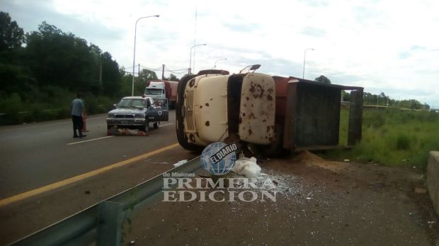 Un camión Mercedes Benz 1.114 volcó alrededor de las 14:10 sobre la ruta nacional 12, a metros del acceso a Garupá.El conductor, de 30 años y oriundo de Jardín América, sufrió lesiones de consideración y fue derivado por una ambulancia de la Red de Traslados al Hospital Escuela de Agudos Ramón Madariaga. Por el momento no se conocen más detalles de su estado de salud.Efectivos de la comisaría de Garupá y de la Unidad Regional X de la Policía provincial investigan las causas del hecho. En el lugar también trabajó la unidad de TUM Bomberos Garupá.