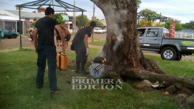 Los bomberos del TUM Garupa y el delegado municipal de Miguel Lanús se hicieron presentes en el barrio Iprodha para tratar de salvar el árbol.Hubo que hacer resguardo de seguridad dado que el ejemplar tiene serio riesgo de caída, ya que fue prácticamente consumido por dentro.