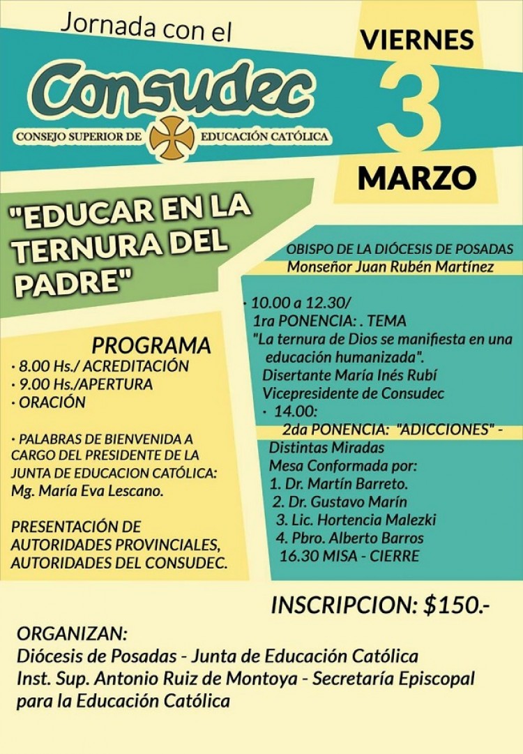 El Consejo Superior de Educación Católica (Consudec), la Junta de Educación Católica (JEC) del Obispado de Posadas, conjuntamente con el Instituto Superior “Antonio Ruiz de Montoya” (ISARM) invitan a todos los docentes a participar de la Jornada con el Consudec que se realizará el viernes 3 de marzo de 2017, en el Salón Auditórium de la Sede Central del ISARM, en Ayacucho 1962 de la ciudad de Posadas, Misiones.A partir de las 8:00 se realizarán las acreditaciones; a las 9:00 se hará la apertura y se desarrollarán las conferencias hasta las 16:30, horario previsto para la celebración de la Misa de cierre.Bajo el lema “Educar en la ternura del Padre”, los invitados especiales ofrecerán sus conferencias. Por la mañana, la primera ponencia estará a cargo de la Vicepresidente del Consudec Licenciada María Inés Rubí, quien aboradará “La ternura de Dios manifiesta en una educación humanizada”. Luego del receso del mediodía, se llevará a cabo la segunda ponencia sobre “Adicciones”, distintas miradas expondrán en una mesa conformada por el Doctor Marín Barreto, el Doctor Gustavo Martín, la Licenciada Hortencia Malezki y el Presbítero Alberto Barros. Para el cierre está prevista la celebración de la Santa Misa a las 16:30 horas.