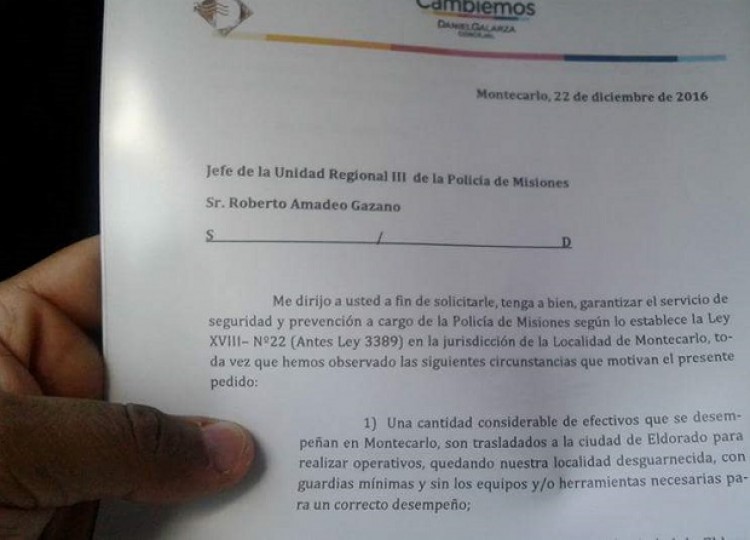 Es que, según el edil, "una cantidad considerable de efectivos que se desempeñan en Montecarlo son trasladados a Eldorado para realizar operativos, quedando nuestra ciudad desguarnecida".Además, "hemos observado que el descanso de los efectivos de nuestra ciudad es insuficiente", lo que pondría en riesgo su integridad.La misiva incluye también otros reclamos. Léala completa aquí: <a href="//www.slideshare.net/PrimeraEdicinDiario/carta-del-concejal-galarza-al-jefe-de-la-uriii-de-eldorado" title="Carta del concejal Galarza al jefe de la UR-III de Eldorado" target="_blank">Carta del concejal Galarza al jefe de la UR-III de Eldorado</a> from <a target="_blank" href="//www.slideshare.net/PrimeraEdicinDiario">Primera Edición Diario</a>