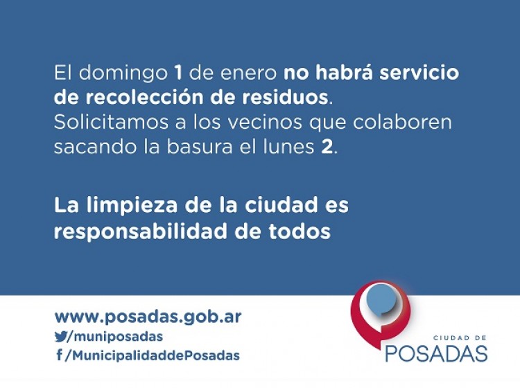 La Municipalidad de Posadas informó que el domingo 1 de enero no habrá servicio de recolección de residuos domiciliarios por la celebración de Año Nuevo. En este sentido, se recomienda colaboración a los vecinos para que coloquen las bolsas de residuos en los contenedores recién desde las 6 de la mañana del lunes 2.El viernes y sábado la actividad será normal pero se adelantarán los turnos a las 6, 10, 14 y 18 horas para que a las 22 los camiones estén en la Base de Servicios Públicos.Por otro lado, el director general del área, Daniel Arce, solicitó a la comunidad el compromiso de mantener limpios los patios de sus casas, sin elementos que junten agua de forma innecesaria ya que son focos de reproducción del Aedes aegypti, mosquito transmisor de las enfermedades dengue, leishmaniasis, chikungunya y zika.No obstante, cabe recordar que en las fiestas de Nochebuena y Navidad, cuando se registró un cronograma similar al de este fin de semana, fueron múltiples las quejas por <a href="http://www.primeraedicion.com.ar/nota/237057/el-despues-de-los-festejos-de-navidad-en-posadas.html">acumulaciones de basuras que los vecinos sacaron a la vía pública</a> a pesar de la recomendación municipal.